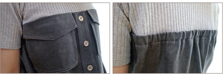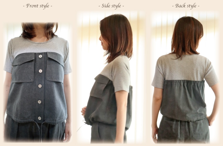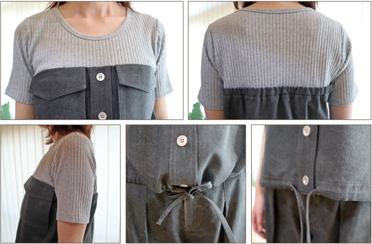 やわらかな着心地のリブカットソーにグレーのダンガリー調デニム素材をドッキングしたビスチェ風デザインのプルオーバー
