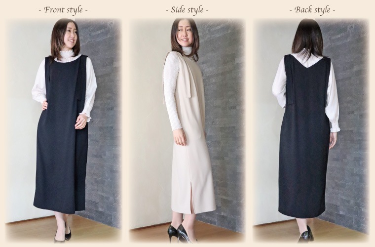 肩にさりげなく施されたリボンディテールと、足さばきの良いサイドスリットが特徴